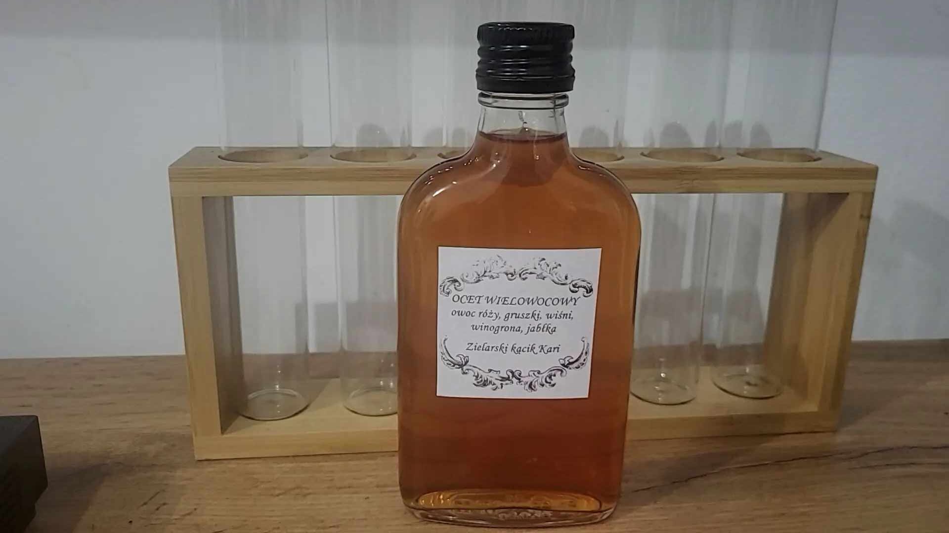 Ocet WIELOOWOCOWY- owoc róży, gruszki, wiśni, winogrona, jabłka- stworzony wedle tradycyjnej receptury, naturalnie żywy-aktywny biologicznie.