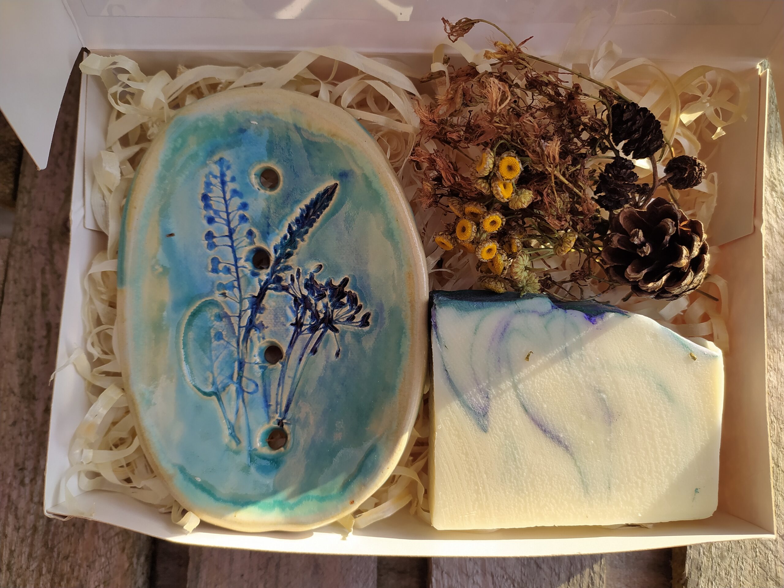 1. Ceramiczna mydelniczka w jasnych lub zielono-niebieskich odcieniach to unikatowy twór rękodzielniczy, każda jest troszkę inna. Posiadają dziurki oraz cztery nóżki, by mydło miało sucho. Łatwe w czyszczeniu i gustowne. Wzory bliskie naturze wykonano przy użyciu dzikich ziół. Orientacyjny rozmiar: 11 na 8 cm.